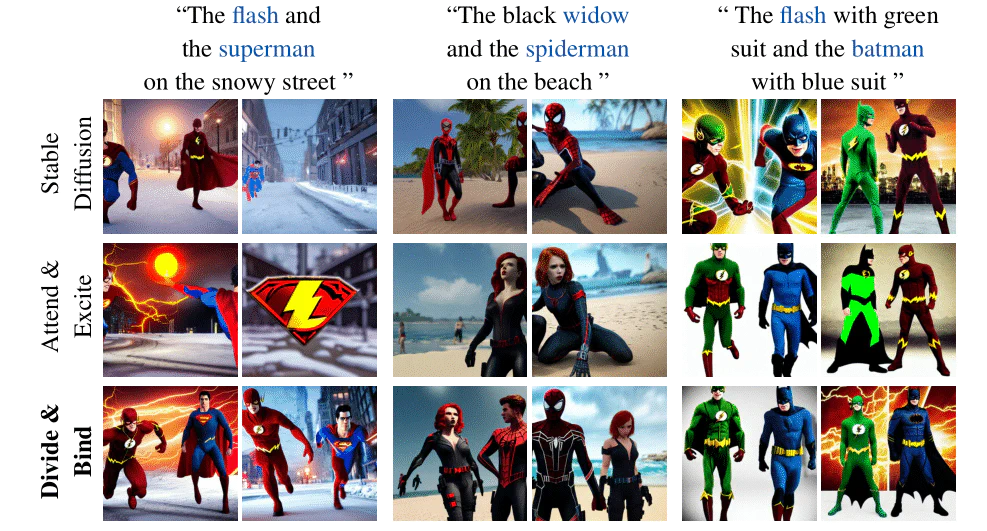 Emerging large-scale text-to-image generative models, e.g., Stable Diffusion (SD), have exhibited overwhelming results with high fidelity. Despite the magnificent progress, current state-of-the-art models still struggle to generate images fully adhering to the input prompt. Prior work, Attend & Excite, has introduced the concept of Generative Semantic Nursing (GSN), aiming to optimize cross-attention during inference time to better incorporate the semantics. It demonstrates promising results in generating simple prompts, e.g., ‘‘a cat and a dog’’. However, its efficacy declines when dealing with more complex prompts, and it does not explicitly address the problem of improper attribute binding. To address the challenges posed by complex prompts or scenarios involving multiple entities and to achieve improved attribute binding, we propose Divide & Bind. We introduce two novel loss objectives for GSN: a novel attendance loss and a binding loss. Our approach stands out in its ability to faithfully synthesize desired objects with improved attribute alignment from complex prompts and exhibits superior performance across multiple evaluation benchmarks.